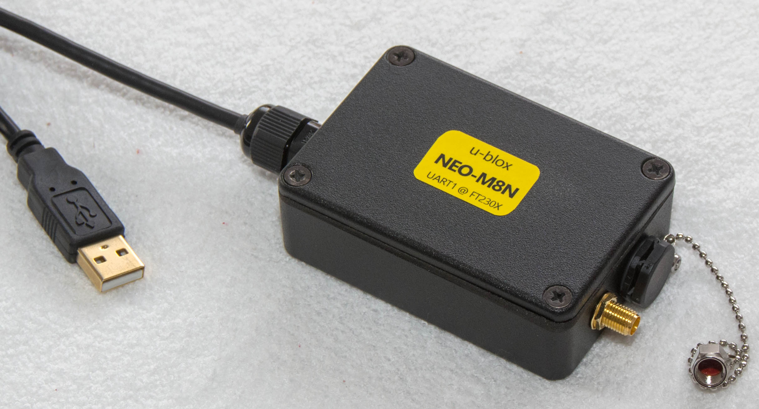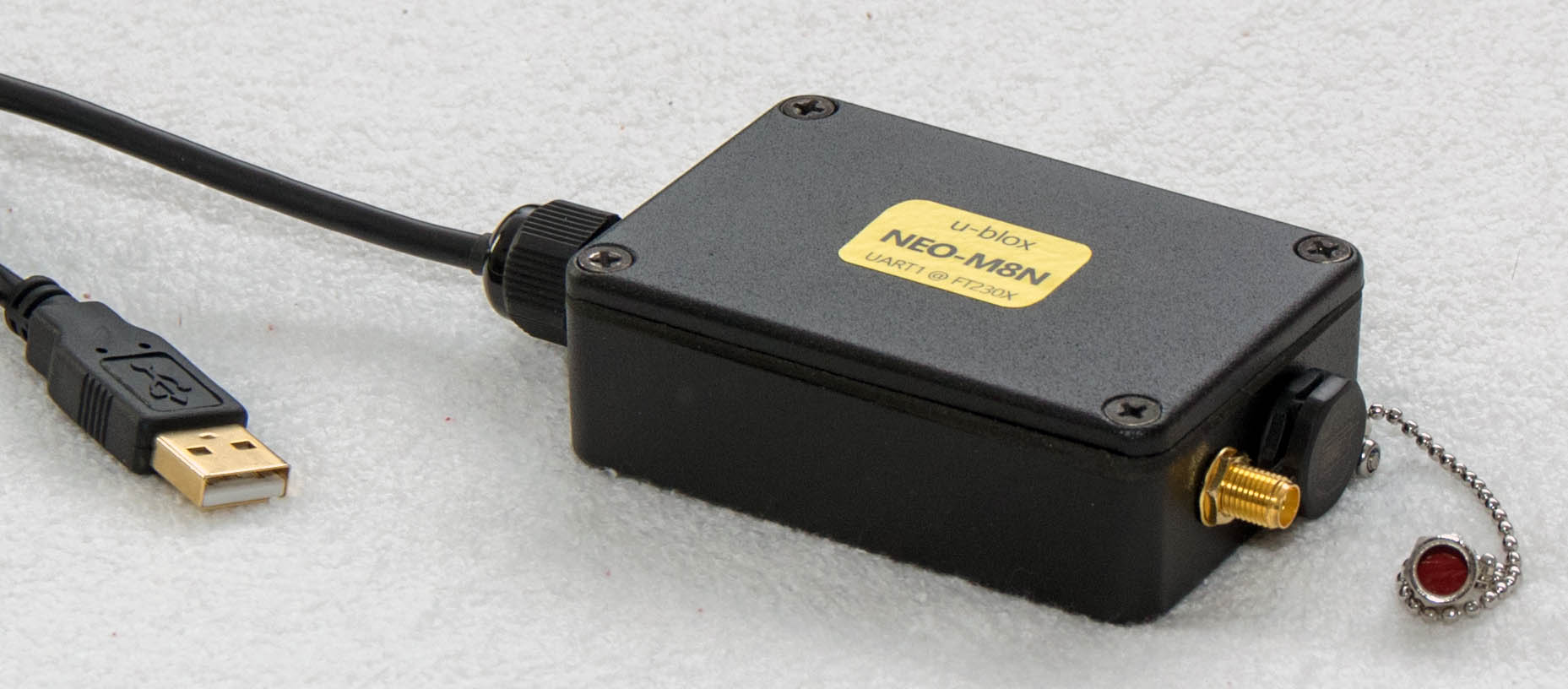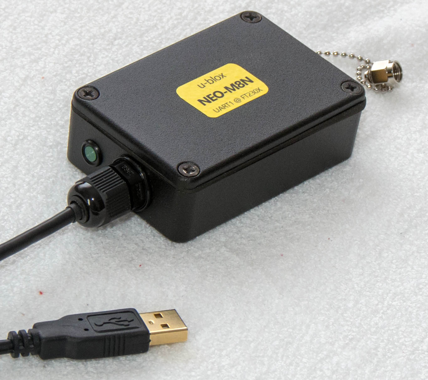 , data output over screwed USB cable (optional by using u-blox native USB port or an additinal FTDI transceiver module connected to the NEO-M8N UART port)